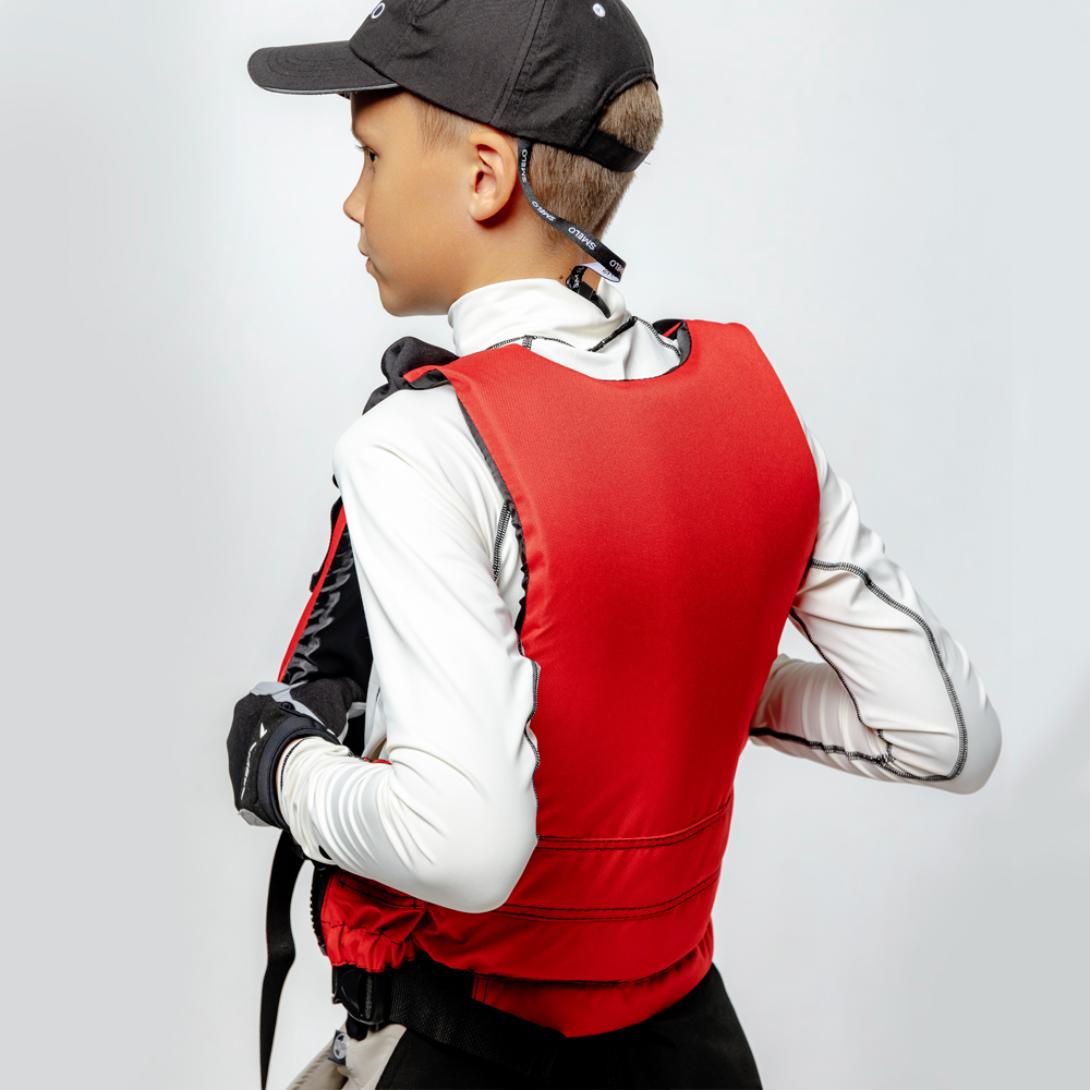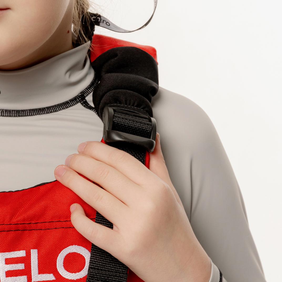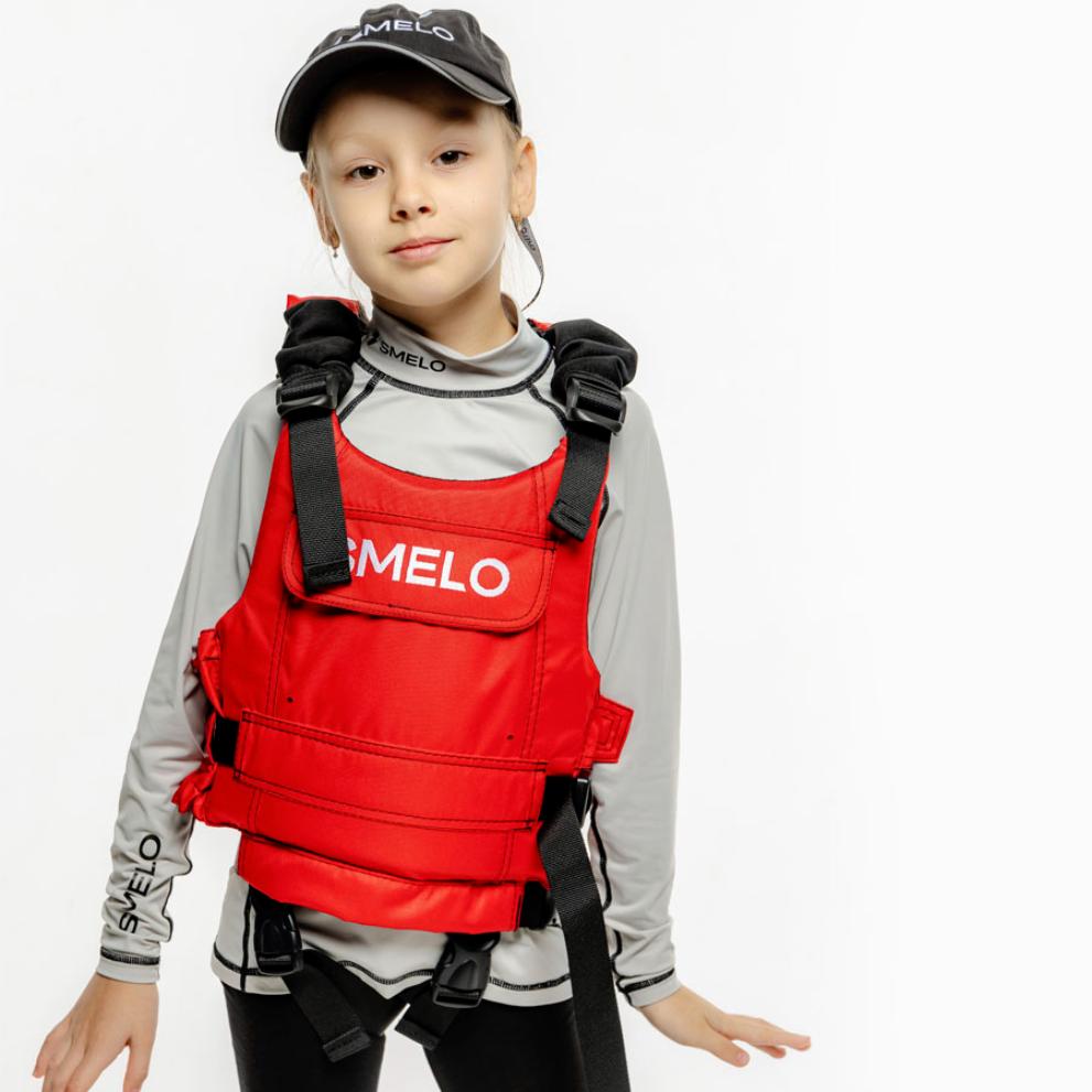 На размере XS и XXS (можно использовать как детский спасательный жилет) предусмотрен ремень, проходящий через внутреннюю часть бедра ребенка, чтобы не допустить его «выскальзывание» из жилета.
